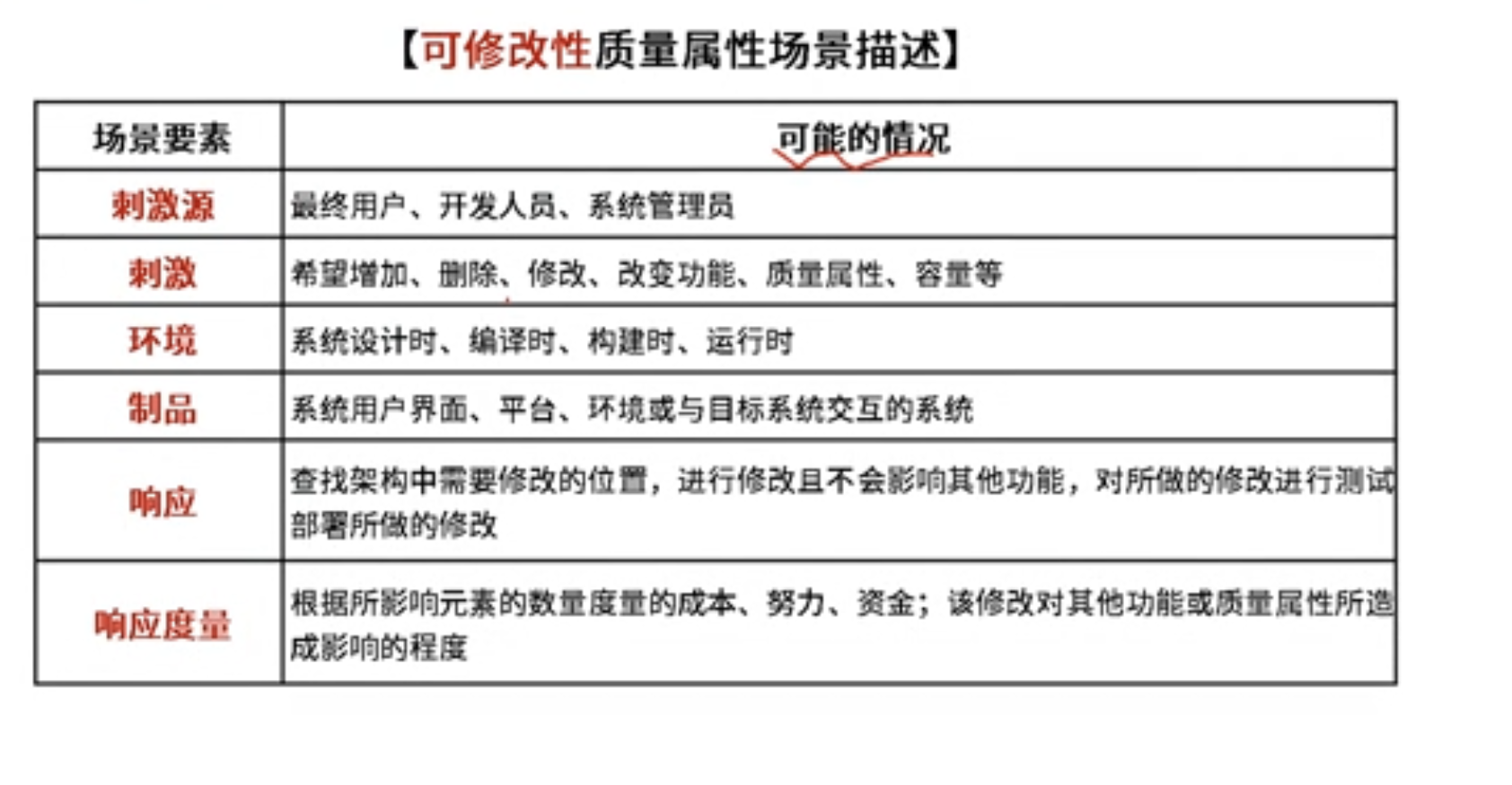 其中,发出更改请求的人(用户)是刺激源,更改 WEB 界面接口是刺激,WEB 界面接口相关的是制品,(没有环境,要素缺乏)是环境,完成更改 是响应,2 人周内是响应度量