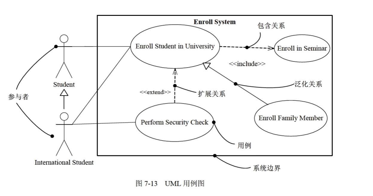 - 一个用例执行的时候,可能会发生一些特殊的情况或可选的情况,这种情况就是扩展用例(比如借书,超过还书期限就要罚款,罚款就是扩展用例)